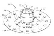 As illustrated in FIG. 3, the bonding material spots30 on theupper surface24 of the sheet ofmaterial22 may be covered with at least onerelease strip32. Therelease strip32 is used to protect the bonding material spots30 before theupper surface24 of the sheet ofmaterial22 and the bonding material spots30 thereon are disposed adjacent theouter surface18 of thebasket12. Therelease strip32 has anupper surface34, alower surface36, and anouter periphery38. Thelower surface36 of therelease strip32 is disposed adjacent the bonding material spots30 on theupper surface24 of the sheet ofmaterial22. It will be appreciated that therelease strip32 is also substantially flat.