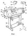 While it is apparent that the plotter components may vary from model to model, thetypical inkjet plotter20 includes achassis22 surrounded by a housing orcasing enclosure24, typically of a plastic material, together forming aprint assembly portion26 of theplotter20. While it is apparent that theprint assembly portion26 may be supported by a desk or tabletop, it is preferred to support theprint assembly portion26 with a pair ofleg assemblies28. Theplotter20 also has a plotter controller, illustrated schematically as amicroprocessor30, that receives instructions from a host device, typically a computer, such as a personal computer or a computer aided drafting (CAD) computer system (not shown). Theplotter controller30 may also operate in response to user inputs provided through a key pad andstatus display portion32, located on the exterior of thecasing24. A monitor coupled to the computer host may also be used to display visual information to an operator, such as the plotter status or a particular program being run on the host computer. Personal and drafting computers, their input devices, such as a keyboard and/or a mouse device, and monitors are all well known to those skilled in the art.