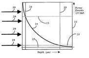 FIG. 1, is a graphical representation of the relationship between the depth of energy deposition and the depth of material removal, also showing an exemplary representation of the spatial distribution of the deposited power density as a function of distance into the target material;