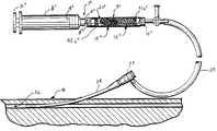 In the present illustrations, the preferred apparatus is configured for use typically with autologous whole blood. FIG. 1 represents a completed apparatus assembly in-place attached to the introducer and in the patient as it would typically be used. Introducer/hemostasis sheath32 is placed through thepatients skin41, i.e., percutaneously with the distal end of the sheath within anartery36. Autologous blood is drawn back from the distal end of thesheath34 by means of pulling back on the syringe plunger. During this process the blood is passed through the heparin removing and clottingcascade initiating chamber20 and into the barrel of thesyringe3. Thesheath34 is then withdrawn to a position just outside of theartery36 as is alternately determined use a pulsitile indicator (not shown). The syringe plunger2 is then advanced by expelling the blood in the barrel of thesyringe3 back through the heparin binding and clottingcascade initiating chamber20, then back through the sheath32 and expelling it into thetissue41 adjacent to theartery36 where the clotting cascade comes to completion.