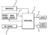 Accordingly, the signal of the passive infrared sensor can be used to activate the image sensor and, if necessary, to switch on the room lighting. Additionally, the ambient brightness may be measured and used to determine whether to switch the room lights off. The signals of both sensors are used to control the heating, ventilation, and/or air-conditioning of the room. The image sensor signal is additionally used to switch-off the lighting.