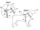 Accelerometer50 provides monitoring of animal body movement and provides input tomicroprocessor51. Many kinds of motion sensors may be suitable for this purpose. A preferred embodiment isaccelerometer50, known in the art. It is a complete 2-axis accelerometer with a 2 g measurement range. It can measure both dynamic acceleration as well as static acceleration forces, including acceleration due to gravity, so the sensor can be used to measure X and Y tilt where it is placed. When the accelerometer is oriented so both the X and Y axes are parallel to the earth's surface it can be used as a two axis tilt sensor with a roll and pitch axis. Ninety degrees of roll would indicate that the dog is laying on its side. In addition, when the accelerometer indicates no movement at all, regardless of the orientation of the dog, the dog is asleep or inactive and the system is powered down, as described above. Thus, the accelerometer can readily detect when the dog is not standing. The accelerometer is placed directly above the shoulder blades and is contained withinremote unit10 and associateddog harness11 as described in FIG.2.