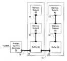 FIG. 5 illustrates a limited memory configuration according to an embodiment of the invention. The memory accessible toprimary memory controller70 is contained in twomemory units74 and78, which may be, e.g., memory modules. Each memory unit comprises a buffer (which may comprise buffer circuitry distributed in several components), capable of functioning as a splitting node, one memory pass-through subunit, and one memory terminal subunit.