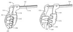 As also shown in the drawings, thesecond lip152 of thesled member140 is a semicircular or oblong shaped member that is disposed in the bottom of the sled member140 a distance back from the front edge lip to selectively engage the recessed side of any of the step surfaces122a-cof the retractor. Thesecond lip152 also is generally configured so the insideinterior surface151 of thesled member140 extends arcuately across and lies upon the top surface of theretractor102 between a front edge surface120a-cand the associated step surface122a-cof the retractor. Thesecond lip152 is slidably mounted on the bottom side of thesled member140 and is movable in response to rotation of theactuator lever154 to form an acute step surface engaging angle between the sledsecond lip152 and the insideinterior surface151 to securely retain the selected step surface120a,120bor120ctherein.