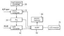 Next, ascaler50 is provided for adjusting a size of the digital R/G/B image signals outputted from the A/D converter40 to a frame unit by using the clock pulse provided by thePLL30 according to a control signal of themicrocomputer10. Asecond memory60 is provided for storing an output from the-scaler50, and anLCD module70 is used to display the digital image signals stored in the second memory after the size adjustment of thescaler50. The first memory is preferably an EEPROM and thesecond memory60 is preferably a frame buffer memory.