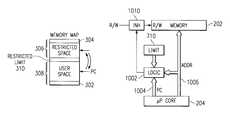 Referring now to FIG. 10, there is illustrated a view of an alternate embodiment for inhibiting the memory operation. In this simplified embodiment, there is provided a control block orlogic block1002 that is operable to receive the output of the Program Counter on abus1004 and the address bus on anaddress bus1006. Thelogic block1002 compares this with information in thelimit register710 to determine what type of operation is being performed, i.e., a program instruction or a memory access instruction, and where in the memory map the address resides. This was described hereinabove. In this embodiment, there is provided an inhibitcircuit1010 that is operable to inhibit a read/write operation tomemory202 in the event that thelogic block1002 makes a determination that this is a restricted operation.