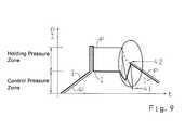 The action of a of the said 2-stage damper on the pressure break in an invented pressure control valve is presented in FIG.9. By a linear increase of the coil current l, there is generated essentially immediately a linear increase of the pressure p in the zone of control pressure. Subsequently, there follows an abrupt climb of both the coil current l and the pressure p up to the system pressure. Up to the attainment of the enlarged presented curve of the pressure break, the pressure p is held somewhat constant at the holding pressure level, while the coil current l, that is, the current impulse, exhibits so-called refresh peaks, which, for the sake of simplicity are not shown, for the maintenance of the holding function.