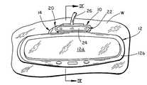 DESCRIPTION OF THE PREFERRED EMBODIMENTSReferring now to the drawings in greater detail, FIG. 1 illustrates afirst embodiment10 of the unitary rearview mirror support and information display assembly for vehicles of the present invention.Assembly10 is adapted to be releasably secured or coupled to the front windshield W of a vehicle below the headliner/header section of the interior roof in position for viewing of arearview mirror12 supported onassembly10.Rearview mirror12 comprises areflective mirror element12ahoused in amirror housing12b. As shown in FIGS. 2-9,assembly10 comprises arigid mirror stay14 preferably formed from die cast zinc and an extending, mirror supportball pivot member16 formed in one piece with the mirror stay onneck18 at the lower end of the mirror stay.Rearview mirror12 pivots aboutball member16. Ahousing20, preferably having its contour matched to a portion of themirror stay14, is preferably removably fitted to the mirror stay, and comprises aninformation display area22 having adisplay element24 for conveying information to the vehicle operator and other occupants of the vehicle interior. As is explained more fully below,housing20 also comprises electrical circuitry for operation of thedisplay22, which circuitry compriseselectrical wiring26 andconnector28 for connecting the information display to the electrical system of the vehicle in which the assembly is mounted. In addition, the electrical circuitry compriseselectrical wiring30 comprising aconnector32 providing electrical service from the vehicle to therearview mirror assembly12 which may be electrically operated as explained below. Theentire assembly10 is adapted for mounting to the inside surface of front windshield W by means of a windshield mounted button B (FIGS. 9,9A and9B) previously adhered to that surface.