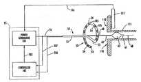 As shown in FIG. 4, theexpandable ablation element53 contains a preformedstylet57 in the body thereof, which is formed of a suitable elastic resilient material that has a memory for the preformed position, such as nitinol. The ablation catheter further contains anelongate tendon57a, conveniently formed of stainless steel wire, running from an actuator or steering mechanism (not shown), running freely withininternal sheath57bthrough the ablation catheter and internally fixed to the end terminus57cof the ablation element (see FIG.1). The internal sheath is aligned along the internal (or external) circumference of theablation element53, so that increasing tension on the tendon increases the diameter of the ablation element. Other portions of the ablation catheter can be stiffened by incorporating a stiffening member (e.g., high durometer steel braid) into the catheter wall so that forces exerted through the tendon are primarily applied to changing the shape of theablation element53. Additional rigidity/stiffness can also be achieved through stiffening of the outer jacket material. A tendon and stylet system of this type can also be used to produce a steerable centering catheter, as described in connection with FIGS. 12-15 below, in which the distal portion of the centering catheter can be changed in shape (e.g., bent), by the application of tension to a steering tendon running laterally, or off-center, in the catheter body, through an internal sheath, and fixed to the distal tip of the catheter (note that the steering tendon need only be off center in the distal section of the catheter, and may run on the centerline in a proximal or intermediate section). Stylets as described herein may be formed of an alloy which exhibits a martensitic phase transformation. Such alloys include those which exhibit non-linear superelasticity (typically Ni—Ti with Ni at 49/51.5% atomic) and those which exhibit linear superelasticity (e.g., Ni—Ti in near equi-atomic composition which has been cold worked). Particularly preferred is a Ni-Ti alloy with 54-57% by weight of Ni. A preferred material for such stylets is nitinol. Of course, other steering systems may also be employed, such as temperature actuated shaped-memory materials. Thus, the steering actuator may be a mechanical actuator (e.g., one that applies and releases tension to a tendon) or an electrical actuator (e.g., on that applies an electrical current to heat a temperature actuated shaped-memory material).