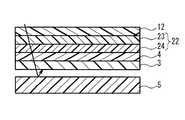 FIGS. 1 and 2 show examples of the above-described polarizing element; and FIGS. 3 to6 show examples of the above-described optical element. Numeral1 denotes a reflective polarizing plate;numeral11 or12 denotes a linearly polarized light separation plate or a circularly polarized light separation plate forming the reflective polarizing plate1;numeral2 is denotes an absorptive polarizer; andnumeral21 or22 denotes an absorptive polarizing plate or a circularly polarizing plate comprising aquarter wavelength plate23 and an absorptive polarizingplate24 forming theabsorptive polarizer2. Numeral3 denotes a quarter wavelength plate, andnumeral4 denotes an absorptive polarizing plate. Numeral5 denotes a lighting device.