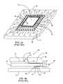 FIG. 9ais a top view of a lead frame strip suitable for use in forming IC packages as prescribed by the present invention, with FIGS. 9band9cshowing successively more detailed views of the elements in the strip. FIG. 9cis a single device area consisting of a patterned substrate;