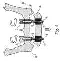 FIGS. 2 and 3 illustrate a distraction process through the example of amandible33 having undergone osteotomy and presenting anosteotomy gap32. The drawings show in particular a distraction process according to Mode A in which the alveolar process is displaced in the cranial direction. As described above, the anchoring screws2 of the endo-distractors are passed through thecranial bone segment34 and through theosteotomy gap32 and are then inserted into thecaudal bone segment35. The anchoring screws2 are screwed into thecaudal bone segment35 until their threadedtips6 protrude from the opposite side thereof. The excessive length corresponds to the amount of distraction to be obtained for the osteotomy gap. The distraction sleeves3 are inserted into thecranial bone segment34 and prevent the anchoring screws2 from moving in the cranial direction. As the anchoringscrew2 is screwed backwards, thecranial bone segment34 is lifted in the cranial direction by the action of the distraction sleeve3, while thecaudal bone segment35 remains stationary.