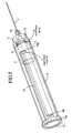 A threaded male joint34 may surround opening13 at the first end of the container of FIG. 2, and a threaded male joint35 may surround opening14 at the second end of the container. Cap36 having a threaded female joint may be screwed onto joint34, coveringopening13, and cap37 having a threaded female joint may be screwed onto joint35, coveringopening14. This is normally done whenever the needle is not intended to be exposed, so as to minimize the risk of accidental contact with the tip of the needle.