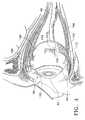 FIGS. 1 through 6 illustrate various portions of the human eye important to a complete understanding of the present invention. Referring first to FIG. 1, ahuman eye90 is schematically illustrated.Eye90 has acornea92, alens93, vitreous95, asclera100, achoroid99, aretina97, and anoptic nerve96.Eye90 is generally divided into ananterior segment89 and aposterior segment88.Anterior segment89 ofeye90 generally includes the portions ofeye90 anterior ofora serata11.Posterior segment88 ofeye90 generally includes the portions ofeye90 posterior ofora serata11.Retina97 is physically attached tochoroid99 in a circumferential manner proximate pars plana13, posteriorly tooptic disk19.Retina97 has a macula98 located slightly lateral tooptic disk19. As is well known in the ophthalmic art,macula98 is comprised primarily of retinal cones and is the region of maximum visual acuity inretina97. A Tenon's capsule or Tenon'smembrane101 is disposed onsclera100. Aconjunctiva94 covers a short area of the globe ofeye90 posterior to limbus115 (the bulbar conjunctiva) and folds up (the upper cul-de-sac) or down (the lower cul-de-sac) to cover the inner areas ofupper eyelid78 andlower eyelid79, respectively.Conjunctiva94 is disposed on top of Tenon'scapsule101.