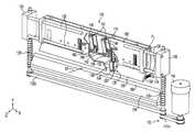Folding apparatus100 also includes a spring (such as one of arm springs110) attached to the second end of the pivot arm, where the spring forces the fold roller against the fold blade as the fold rollers rotates along the longitudinal axis of the fold blade. In the embodiment shown in FIGS. 1A and 1B, eachspring110 is attached to apivot arm108 and to anarm axle144. When housing102 is advanced such thatrollers106 press againstfold blade104, springs110 maintain pressure againstfold blade104 viarollers106 ashousing102 continues its advancement (this process is described below).Springs110 can be torsion springs or can be in the form of any other biasing components. All of thesprings110 can have identical spring rates, or these rates can differ from onespring110 to the other. Depending on the spring rates used, very high forces in the −y-axis (i.e., towards fold blade104) can be achieved, and sheet material of varying composition and thickness can be folded.