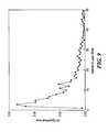 EXAMPLE IIISignal DecayIn order to determine how many shots of the desorption laser will produce optimal mass spectra, a mixed solution of 1 uM angiotensin III with 10 mM αCHCA matrix in methanol was deposited on the quartz wheel rotating at 0.33 rpm. Infusion was interrupted after ˜30 seconds, and the wheel was rotated to transfer the sample trace to the desorption region. The desorption power density was adjusted ˜20% above the threshold, and 100 shots were applied consecutively to each of 3 neighbor segments on the sample trace. The peak areas corresponding to the analyte ion (m/z=932) were calculated from 100 average spectra (each spectrum was an average of 3 single shot spectra from the 3 segments of the trace) and plotted versus the number of desorption laser shots, as shown in FIG.8. The first laser shot was found to produce a lower ion signal from the analyte than the next nine laser shots. This result, together with a difference in mass spectra in the low-mass region (not shown), suggests some chemical and physical changes (melting & solidifying) occurring on the sample surface. This behavior of the first shot was variable however, since for some samples, the intensity of the ion signal of the analyte produced by the first shot was similar to that of the consecutive shots. Similar phenomena can also be observed in conventional MALDI (67).