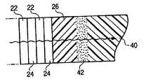 As can be seen in FIG. 1, a problem exists in layering afilm20 onto asubstrate40. For example, coupling afilm20 made fromalternating layers22,24 of PEN and coPEN (or PEN and PMMA) to asubstrate40 having different mechanical, chemical or optical properties. Thenumbers22 and24 may also represent any pair of polymers used in organic, optical, dielectric films. In layering the film onto the substrate, anintermediate medium30 occupies any spaces or gaps therebetween. Theintermediate medium30 maybe adjacent one of thealternating layers22 or24, or it maybe adjacent askin26 made from one of the polymers of the film and made several times thicker than the layers, for example. In the simplest case, theintermediate medium30 consists ofair32. Alternatively, theintermediate medium30 consists of an adhesive34, or optical grade adhesive, having an index of refraction matching the film, the substrate or some value in between. These layered constructs possess two refractive boundaries: the first refractive boundary is disposed at the film exterior orskin exterior26a,where the film or skin meets theair32 or adhesive34; and the second refractive boundary is disposed at thesubstrate exterior40a,where theair32 or adhesive34 meets the substrate. Theserefractive boundaries26aand40aact as partial mirrors reflecting light at all wavelengths and reducing the overall transmission of the resulting filter. As can be appreciated, such reduction eliminates the desirable high efficiency of the film. This reduction is illustrated by a light wave passing through the ensemble from left to right in FIG.1. Note that as the light wave crosses26aand40asome portion of the light is reflected, regardless of the material properties of theintermediate medium30.