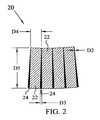 Still referring to FIG. 2,electrodes24 may be constructed to any size, so long as their cross-section is substantially trapezoidal in shape and when disposed adjacent toceramic elements22 together arrange a circular formation. Typically,electrodes24 are made as thin as possible while still allowing for the circular formation described previously.Electrodes24 have two substantially parallel sides, one of width D2 and one of width D3, and two non-parallel sides. By way of example,electrode24 has one parallel side of width D3 that is about 0.050 inches, another parallel side of width D2 that is about 0.005 inches and a height D5 of 1.4 inches.