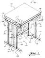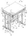 Thesupport structure105 generally includes twoend frames115 connected to acenter frame120. The end frames115 and the end frame are connected to atop frame125. Thesurface110 is rotatably connected to thetop frame125. Thetop frame125 is generally a square or rectangular shape. Side beams130 define outer edges of the perimeter of thetop frame125. There are also one or more cross beams (not shown) that support the point of rotation of thesurface110 with respect to thetop frame125 and the other constituent components of thecentral support structure105. Each of the end frames115 generally includes afooter135 and twoelongated beams140 with one end connected generally perpendicular to thefooter135 and generally parallel to each other. Thefooters135 can include levelers so that the work surface can be suitably leveled if it is on an uneven floor. Thefooters135 can also include wheels, rollers, casters and the like in so that the table100 can be easily moved from position to position as needed. The wheels, rollers, casters and the like can include locks so that the table100 does not roll around. Thefooters135 can also include additional rods that can be locked to thefooters135 with a locking screw. The rods could be used in conjunction to adjust the overall height of the table100. Any of the above mentioned features of thefooters135 can be integral with thefooters135 or can be added as kit features. The other end of thebeams140 is connected to headbeams141 of theend frame115. The ends of the perimeter beams130 generally lie on top of a portion of the head beams141. Thecenter frame120 generally includes twoelongated beams145 generally parallel to each other with one ormore cross beams150 connected between and generally perpendicular to the elongated beams145. The elongated beams are connected toplates155 at a point ofrotation160. The elongated beams are adapted to rotate about theplates155.Plates155 are located on thefooters135 and onhead beams141 and are arranged generally parallel to the ground. In another embodiment, theplates155 can be replaced by one or more smaller plates that can also function as a point of rotation.