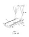 Typical reorienting treadmills having a tread base that is rotatably attached to a support structure and orientable from a first position for performing exercises to a second position for storage, are disclosed in U.S. Pat. No. 5,772,560 (Watterson) and U.S. Pat. No. 5,676,524 (Watterson). U.S. Pat. No. 5,772,560 shows a treadmill (FIGS. 1 and 2) that includes atread base100 and asupport structure200. Thesupport structure200 has feet means and an upright structure extending upwardly from the feet means. The front portion of thetread base100 is rotatably connected to thesupport structure200 to rotate about an axis, so that thetread base100 can be oriented from a first position ready for a user to perform exercises (see FIG.1), to a second position for storing the treadmill (see FIG.2).