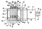 In one specific aspect of the invention, theouter surface32 of thebarrel31 is tapered approximately 3° toward the dispensing end30aof theligator30. It has been found that a sloped surface enhances the ability of the beads49a-eto pull the bands off of thebarrel31 when the ligating bands, such as thebands40, have a relatively flat surface in engagement with theouter surface32 of thebarrel31. Alternatively, thebarrel31 can have a uniform outer diameter, with the understanding that greater pulling force may be required to release thebands40. As a further alternative, the ligating bands may have a circular cross-section wherein they may more readily slide or roll off thebarrel31. It should also be noted that the leading inner and outer circumferential edges of the distal end ofbarrel31 are rounded off at57 at58, respectively, as is the proximalcircumferential edge59 ofadapter35. This rounding off helps prevent possible erosion of the vessel wall that is being treated by the ligatinginstrument10 of the present invention.