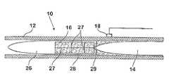 Referring to the embodiments of FIGS. 9 and 10, complementary wedging surfaces34,36 are disposed onspacer assembly28 andprojectile head26 respectively whereby thin cylindricalrear portion30 ofprojectile head26 is urged into engagement with the bore ofbarrel12 in response to an axially compressive load being applied toprojectile assembly14.Projectile head26 defines a taperedaperture38 at its rearward end into which is received a complementarytapered spigot40 disposed on the leading end ofspacer assembly28. Relative axial movement between taperedaperture38 and complementarytapered spigot40 causes a radially expanding force to be applied to thin cylindricalrear portion30 ofprojectile head26.