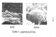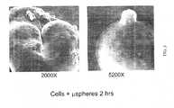 EXAMPLE 4Scanning Electron MicroscopyScanning electron microscopy was conducted. Samples were removed from the cell/microparticle suspensions at 0, 2, 4, and 16 hours and analysed by SEM as described below. Glass coverslips were coated with a thin layer of TissueTack adhesive. Liquid samples (500 μL) of the cell/microparticle suspension were layered onto the coverslips in a 24 well plate and allowed to settle for 30 minutes. Samples were then fixed with 2.5% gluteraldehyde, critical point dried, sputter coated with Au/Pd and visualized via SEM. SEMs of the cell/microparticle suspension following 2 hours and 8 hours of incubation are shown in FIGS. 3 and 4 respectively, at the indicated magnifications. The SEMs showed attachment of cells to single microparticles at 2 hours, with large clusters of multiple cells and microparticles present at 16 hours.