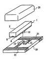 Asubstrate20 preferably includes an insulating thin plate having a substantially rectangular shape and also is made of a material including one of an alumina-ceramic material, a glass-ceramic, a glass epoxy resin, a heat resistant resin, or other suitable material, and thepattern electrodes21 and22 of an input side and an output side are disposed on the top of thesubstrate20 by well-known procedures, such as a sputtering, vapor deposition, and printing. The exterior connection portion of each of thepattern electrodes21 and22 is extended through a side edge of thesubstrate20 to a back surface thereof. With the inner side edge portion of thepattern electrodes21 and22, the electro-conductive support bodies10 and11 fixed to the longitudinal center section (node portion) of theexternal electrodes8 and9 of thepiezoelectric element1 are fixed through the electro-conductive adhesives12 and13. As the electro-conductive adhesives12 and13, an epoxy group adhesive that contains about 73% by weight of the Ag filler, for example, is used. Thereby, theexternal electrodes8 and9 for defining input and output electrodes of thepiezoelectric element1 are respectively electrically connected to thepattern electrodes21 and22 of thesubstrate20. Moreover, thepiezoelectric element1 is horizontally attached by the electro-conductive support bodies10 and11 to thesubstrate20, and a predetermined gap is provided between both ends of thepiezoelectric element1 and thesubstrate20.