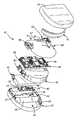 FIG. 7 is an interior view ofdevice10 at a second stage in the assembly process showing application of anadhesive material58,60 to the bottominterior surface54 ofshield12 within mountingregions38,36, respectively.Adhesive material58,60 may take the form of a conventional epoxy resin and a catalyst that are automatically applied to the interior surface ofshield12 just prior to placement ofbattery40 andcapacitor42.