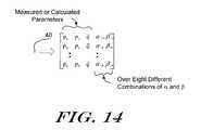 Referring now to step62 of FIG. 2, it has been found that under some circumstances, some of the coefficients of the X matrices cannot be uniquely determined by examining a single flight condition. For example, and referring again to FIG. 14, the first two entries in the characterization data for each flight condition (e.g., static pressure and dynamic pressure) are typically the same for all values of α and β, and therefore cannot be uniquely determined. Thus, to allow resolution of the first two entries in the X matrix, nearby flight conditions may be used with α and β set at zero, as indicated atstep66 of FIG.2. This is more clearly shown in FIG. 13, where nearby flight conditions such asflight condition68 may be used to uniquely determine the first two entries in the X matrix forflight condition64. This part of the calibration procedure allows for correction of static defects, which are sometimes a significant source of calibration difficulties depending on vehicle configuration, sensor location and flight condition.