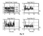 The high frequency contributed by the bearing noise can clearly be seen as increased high frequency content in the spectral plot. Applying the SPRA method we obtain the series of plots shown in FIG.12. In FIG. 12ait is obvious that the energy in the mid and high frequency bands has increased relative to the low frequency power. This is directly related to the bearing noise. We can also see that the power ratios R1 and R2 have increased from an approximate average of 0.3 and 0.2 to 0.75 and 0.65 respectively. We can also see qualitatively that the standard deviation of the power ratios has increased as well.