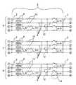 Each phase line has fourconductors4 and is provided with four pairs ofswitches6. Furthermore, on each phase line, an equivalent circuit of inductors and mutual inductors ofline8, and of resistors ofline10 is indicated. For discussion purposes, one neglects the capacitive effects of the line. The pairs ofswitches6 of a phase line with n conductors can pass a current in1,2, . . . or n conductors depending on the current available for deicing purposes. For security reasons, the pairs of electromechanical and electronic switches are controlled so as to conduct the phase current of each phase line through at least one of the corresponding electromechanical switches so as to not open the line. Thus, the electromechanical switches of the pairs ofswitches6 never all open simultaneously the n conductors of a phase line.