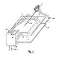 FIG. 2 shows in more detail an embodiment of the present invention as applied to a patient'sbreast2. In this figure, the patient's breast2 (shown in dotted lines) is compressed in a mammography system between anupper mammogram plate8 and alower mammogram plate4. Thebreast2 is shown to be compressed craniocaudally to prepare it for the insertion of a surgical instrument, here aneedle14. Theneedle14 is affixed to a detachableneedle holder assembly12 at its distal end. Included in theneedle holder assembly12 is a position sensor (not shown) that gathers signals related to the position of the needle. The position sensor is integrated with the tracking system of the present invention, as described herein. The position sensor is in electrical communication through acable20 with the fixedpart18 of the tracking system, shown here as related to theupper mammogram plate8 andlower mammogram plate4. In one embodiment, the fixedpart18 of the tracking system may be adjusted so that it can be affixed to both mammogram plates after the breast has been compressed between them. Other affixations also may be suitable, so that thefixed part18 remains in a stable stationary relationship to the mammogram plates or to the compressed breast during the biopsy procedure. In the depicted embodiment, a radio-opaque reference marker24 is shown situated on thelower mammogram plate4 to aid in the calibration and orientation of the tracking system. As depicted in FIG. 2, the fixedpart18 of the tracking system is located at the lateral aspect of the mammogram plates, so that in this figure the fixedpart18 is situated lateral to the lateral aspect of the patient's compressed right breast. This arrangement is for convenience only, and other arrangements may be set up to position the fixedpart18 that accommodate the needs of the operator. Acalibration cross22 is integrated with the fixedpart18 of the tracking system to allow its calibration, as described in the present application. Thefixed part18 of the tracking system also bears aplatform30 for holding theneedle holder assembly12 when it is not in active use directing a surgical instrument. Acable32 or set of cables may connect the fixedpart18 of the tracking system with the other components of the guidance system. In other embodiments, a transmitter may be attached to the fixedpart18 to transmit signals to the other components of the system. There is anaccess window10 adapted for positioning over a lesion of thebreast2 so that theneedle14 can penetrate the lesion at a direct angle through thewindow10. Theaccess window10 is dimensionally adapted for permitting access to a breast lesion for biopsy while still maintaining compression of the breast in a preselected position. In certain embodiments, theaccess window10 may comprise a grid or a screen, or may contain a plurality of removable segments, or may comprise multiple insertion pores. In certain embodiments, theaccess window10 may be fabricated partially or entirely from a structurally stable material that is readily penetrable by theneedle14. Theaccess window10 may be adapted for use on a single patient and may be disposable. Other configurations of theaccess window10 may be known or devised with no more than routine experimentation by ordinary skilled practitioners.