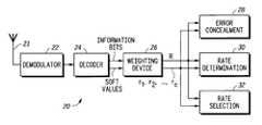 Turning now to the drawings, and in particular to FIG. 1, there is illustrated anapparatus20 in accordance with an embodiment of the present invention. Theapparatus20 can be included in a receiver used in a wireless communication system. The apparatus includes anantenna21, a radio frequency (RF)demodulator22, adecoder24, aweighting device26, anerror concealment procedure28, arate determination procedure30, and arate selection procedure32.
