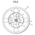When thespindle5 is rotated by the motor (not shown), the dies7 and the hammers6 are rotated in unison, and thecam surface6aof each hammer6 is in sliding contact with the outer peripheral surface of theroller4, and when the apex of eachcam surface6ais brought into contact with theroller4, the dies7 are closed in the directions of arrows D, and then a foot portion of eachcam surface6ais brought into sliding contact with theroller4, and the hammers6 and the dies7 are slidingly moved outwardly as indicated by arrows E under the influence of a centrifugal force, so that the dies7 are opened. Thus, the plurality of dies7, while rotating, are opened and closed.