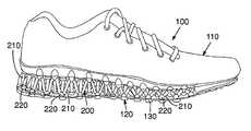 The primary elements offootwear100 are an upper110, which may be of any conventional style, and a sole120. The function of upper110 is to provide a comfortable and breathable structure that securesfootwear100 to a foot of a wearer.Sole120 is attached to a lower portion of upper110 and is positioned between the foot and the ground.