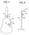 With reference back to FIG. 2, in one particular embodimentflexible magnet114 has anedge210 formed with an arcuate shape which conforms to an arcuate edge along a front surface of a typicalacoustic guitar body102. With such shaping,flexible magnet114 appears to “blend” intoguitar100 as part of the guitar's intended design. This shape will also advantageously conform to the similarly formed adjacent corner along the front surface ofacoustic guitar body102, which is important since many acoustic guitars have a “cutaway” along the corner shown in use in FIG.2. In an even more particular embodiment,flexible magnet114 has anedge210 which is formed with an arcuate shape that is symmetrical, so that it conforms and fits in the same manner on either arcuate corner of the front surface ofacoustic guitar100.