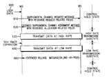 When user data is generated in the mobile station in thecontrol hold state230, the mobile station transmits a resource request message to a base station in order to transit to the lowrate transmission substate220. A DCCH is maintained between the mobile station and the base station in thecontrol hold state230. In this state, the transmission rates of a pilot signal transmitted from the mobile station and power control bits (PCBs) transmitted from the base station can be reduced to decrease consumption of resources needed to maintain the DCCH. For example, the transmission rates of the PCBs and the pilot signal can be decreased from 800 per sec to 400 or 200 per sec to thereby reduce the power consumption of the mobile station and interference. However, since the decrease of the transmission rates is effective when there is no transmission data or a small amount of transmission data, it is not suitable for transmission of user data. Therefore, when thecontrol hold state230 is transited to theactive state200, it is necessary to continuously transmit the pilot signal and the PCBs at predetermined rates. “CH_IND=R-PICH” attached to the resource request message in FIG. 3 represents a request of continuous transmission of a reverse pilot and a power control signal.