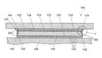 FIG. 6 illustrates amicroelectronic device assembly160, according to the present invention. As shown in FIG. 6, the microelectronic die144 includes atrench sidewall124, alip142 and adice channel sidewall140 which comprise at least onemicroelectronic die side150. The microelectronic die144 is attached to asubstrate146, such as a package substrate or motherboard, by a plurality ofsolder balls148 extending betweeninterconnection layer108 of themicroelectronic die144 and thesubstrate146, using flip chip assembly processes known in the art. Aheat dissipation device152 is attached to thebackside metallization layer128 by athermal interface material154. Thethermal interface material154 is usually a metal or solder material including, but not limited to, lead, tin, indium (preferred), silver, copper, and alloys thereof. The thickness of thethermal interface material154 between theheat dissipation device152 and thebackside metallization layer128 may be between about 25 microns and about 300 microns thick, but is not limited to this range. A preferred thickness range is between about 150 microns and 200 microns.