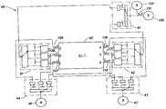 Referring to FIG.5(a), there is illustrated another embodiment of an optimum 6-port MTS40 that can be used to measure a 6-terminal DUT. This embodiment of an optimized 6-port MTS40 comprises onereference channel102, twotest channels46 and47, and a single pole, double-throw absorptive-type switch41 that switches the test signal output bysource100 to one of two single-pole, three-throw absorptive-type switches51,42. The single-pole, three-throw absorptive-type switches51,42 switch the test signal to one of the 6-ports of the 6-port MTS that are coupled to respective terminals of the 6-port DUT45 (in FIG.5(a) the test signal is represented as provided to port one of the MTS andterminal1 of the DUT). It is to be understood that with this embodiment, for each sweep of the test signal provided by thesignal source100, with the appropriate switching of single-pole, three-throw, absorptive-type switches51,42, and single-pole, three-throw absorptive-type switches43 and44, a ratio of two test channel measurements (A/R and B/R) can be determined. Accordingly, it is to be understood that for each sweep of the test signal, two S-parameters of the DUT can be determined. Therefore a total of eighteen sweeps of the test signal can be provided by this embodiment of the MTS to measure all thirty-six S-parameters of the DUT.