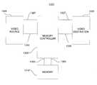 Typical frame buffer architectures often also utilize “double-buffering.” Double-buffering is a well known technique where the memory address space of a frame buffer is divided into two sections. In some architectures, each section is a separate memory device, and in other architectures one or more devices are each divided into sections. Data from a frame is stored in one section while data from a previously stored frame is read from the other section. Series of reading and writing operations alternate. For example, after storing pixel data for 16 pixels, pixel data for 16 pixels is retrieved. After storing a frame, the sections switch roles. Pixel data for blocks of pixels can be temporarily stored before being sent to memory or after being received from memory in a buffer, such as a FIFO buffer. Inarchitectures400 and500 from FIGS. 4 and 5, respectively, FIFO buffers can be included in both the video source and the video destination, or in the memory controller.