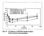 FIG. 3 is a plot of blood glucose concentrations following i.v. administration of exemplary compositions of pegylated (5K PEG Insulin) versus non-pegylated insulin (details are provided in Example 7);
