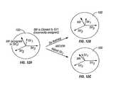 Referring now toFIGS. 1aand1b, there is shown a simplified model of the vector space representation of merchants and consumers. Thevector space100 is shown here with only three axes, but in practice is a high dimensional hyper-sphere, typically having 100-300 components. In thisvector space100, each merchant is assigned a merchant vector. Preferably, the initial assignment of each merchant's vector contains essentially randomly valued vector components, to provide for a quasi-orthogonal distribution of the merchant vectors. This means that initially, the merchant vectors are essentially perpendicular to each other, so that there is no predetermined or assumed association or similarity between merchants.