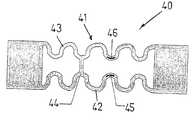 FIG. 4ashows a further embodiment of acomponent40 according to the present invention in which bellows-like structure41 is integrated into the deformation area. In this case, bellows-like structure41 is implemented in the form of two undulated connectingwebs42 and43, each having four loops, that connectfirst junction area15 tosecond junction area16. This component structure therefore does not have a reinforced central area, but is stabilized solely by anintermediate beam44. In this case as well, undulated connectingwebs42 and43 extend vertically across the entire thickness of the component structure.Piezoelectric resistors45 and46, which are positioned so that they undergo a change in resistance only in the presence of deformations perpendicular to the component structure, but not in the presence of lateral stresses in the component structure, are provided on thin connectingwebs42 and43. This arrangement is described in greater detail below on the basis ofFIGS. 4band4c.