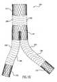 FIG. 10 illustrates an alternative branching endoluminal prosthesis assembled from prosthetic modules, including modules having highly flexible sections along which a liner is supported by helical windings, according to the principles of the present invention.