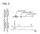 Anelectrocardiograph24 includes twoelectrodes22 which are adapted to be worn on respective body portions of thesubject14 that are distant from each other via the heart, and which cooperate with each other to provide an electrocardiogram signal SE representing an action potential of the cardiac muscle of thesubject14. In the present embodiment, the twoelectrodes22 are worn on a right wrist and a left ankle of thesubject14, respectively, to provide a two-electrode-induced electrocardiogram. The electrocardiogram signal SE produced from theelectrodes22 is amplified by an amplifier, not shown, of theelectrocardiograph24, and then is supplied to thecontrol device20 via an A/D converter26.FIG. 2 shows a waveform of the heart sounds detected by themicrophone12, and a waveform of the electrocardiogram detected by theelectrocardiograph24.
