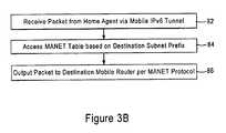 Hence, registration of themobile routers16 with theirhome agents18 by thegateway12 eliminates the necessity for themobile routers16 to utilize mobile IPv6 protocol. As illustrated inFIG. 3B, thepacket router resource36 responds to reception of a packet from ahome agent18 via a mobile IPv6 tunnel instep82 by accessing instep84 the MANET table32 based on the destination subnet prefix, and outputs instep86 the packet to the destinationmobile router16 according to MANET routing protocols.