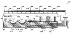 A microparticle may, for example as inFIG. 19A, switch from astraight track1903 running near an arc of a secondcurved track1905, to that second track.Microparticle1901 is shown inFIG. 19A as switching from thelinear track1903 to thecurved track1905 under control by thecontroller unit1907. Track or conveyance circuit switching may occur by passing a microparticle on a first track having a first lower degree of attraction for the microparticle by a second track which has a greater attraction for the microparticle, to cause the microparticle to leave directional control of the first track and become directionally controlled by the second track. After switching tracks, the microparticle then proceeds along the path of the second track. In other embodiments, a microparticle may be accelerated such that it develops achieves an escape velocity and tangentially leaves one track to ballistically continue onto a second track which then decelerates the microparticle to maintain control over the microparticle. In other embodiments, track switching may be caused by the activation of a biasing element adjacent a junction of two tracks to cause a microparticle traveling along the first track to be attracted onto the second track, or repelled off of the first track onto the second track, or a combination of both if two or more biasing elements are employed.