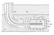 FIGS. 245 and 246 depict representations of embodiments of in situ conversion process systems that may be used to produce a thin rich hydrocarbon layer. To produce such layers, directionally drilled wells may be used to heat the thin hydrocarbon layer within the formation, plus a minimum amount of rock above and/or below. In some embodiments, the heat source wells may be placed in the rock above and/or below the thin hydrocarbon layer. The wells may be closely spaced to reduce heat losses and speed the heating process. In addition, drilling technologies such as geosteering, slim well, coiled tubing, and other techniques may be utilized to accurately and economically place the wells. Conductive heat losses to the surrounding formation may be offset by a high oil content of the thin hydrocarbon layer, rapid heating of the thin hydrocarbon layer (e.g., a heating rate in the range of about 1° C./day to about 15° C./day), and/or close spacing (meter scale) of heaters. Subsidence may be reduced, or even minimized, by positioning heater wells in a non-hydrocarbon and/or lean section of the formation immediately beneath and/or at the base of the thin hydrocarbon layer. A non-hydrocarbon and/or lean section of the formation may lose less material than the thin hydrocarbon layer. Therefore, the structural integrity of formation may be maintained.