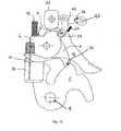 FIG. 3 shows the movement of thedrive arm30 under the action ofmotor28. OnFIG. 3, to clarify the description,lever18 is shown behind thepawl8 andpawl lifter6. Operation of thefirst contact33 byrelease coupling lever32 energizes themotor28, which drives thedrive arm30 towardsrelease coupling lever32 and thefirst bearing surface12 of thepawl lifter6, as illustrated byarrow66. Under the effect of the drive force ofmotor28, transmitted by thedrive arm30 andrelease coupling lever32, thepawl8 andpawl lifter6 are driven counter-clockwise in rotation about theaxis10. This rotary movement is shown byarrow68 on FIG.3.